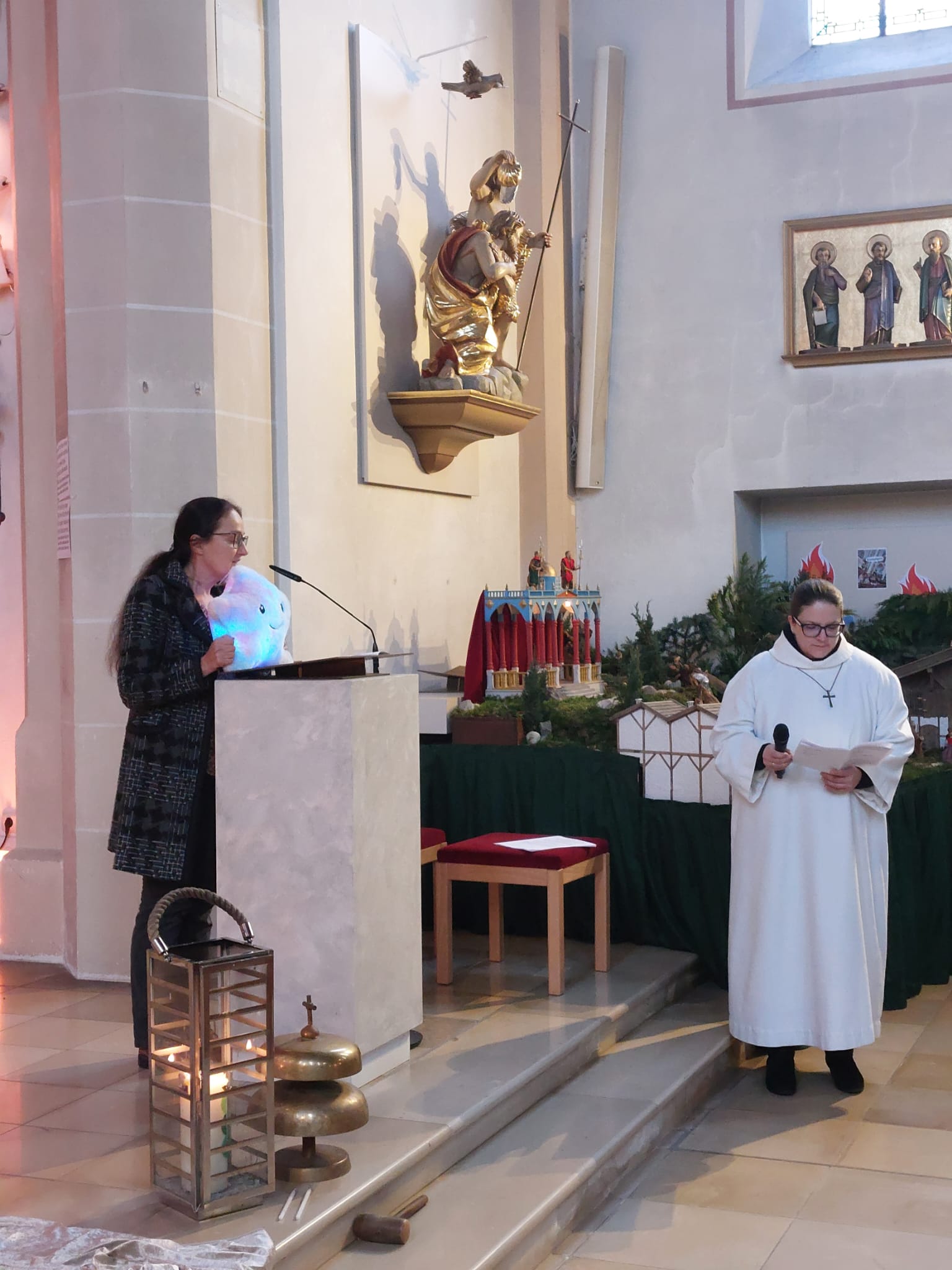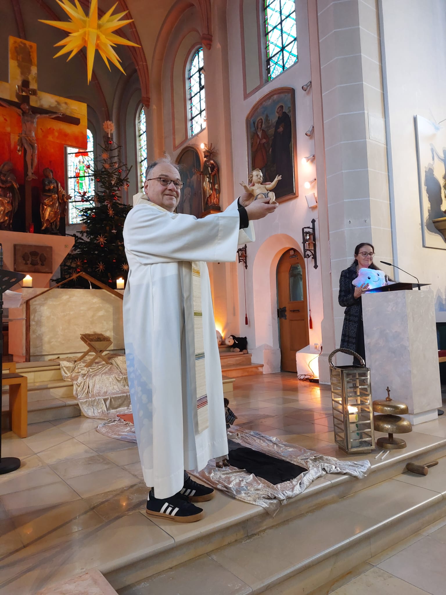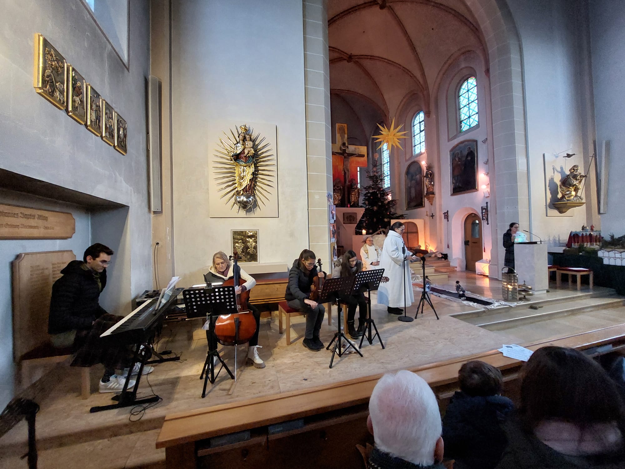 Zuvor hatten schon die Familien mit Klein- und Kindergartenkindern die Geburt Jesu in einem kindgerechten Gottesdienst gefeiert. Das Maskottchen der adventlichen Kindergottesdienste, Stern „Zacki“ alias Kinderwortgottesdienstleiterin Dr. Susanne Konrad, sowie Pfarrer Stefan Altschäffel und Gemeindereferentin Barbara Iberer ließen die Weihnachtsbotschaft in einer pantomimischen Mitmachgeschichte lebendig werden. Zu den Fürbitten entzündeten Kinder Lichter am Friedenslicht von Betlehem und stellten sie bei den adventlichen Gestalten Jesja, Johannes, Maria und Josef auf dem Weg zur Krippe ab. Die wunderbare musikalische Gestaltung übernahmen Adrian Dombroth am Klavier, Anna Beyerl an der Geige, Luisa Beyerl an der Gitarre, sowie Monika Schwarz am Cello. Ein großes Dankeschön für allen Einsatz.
