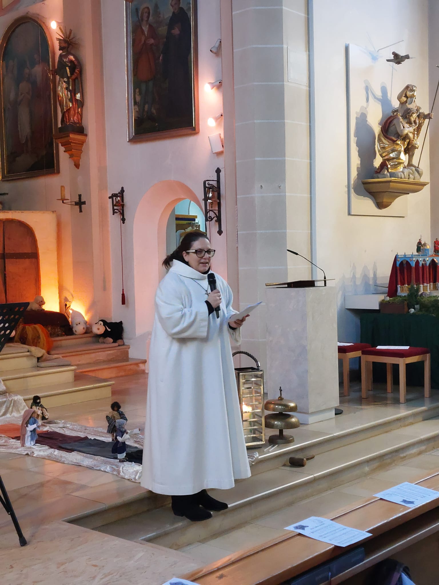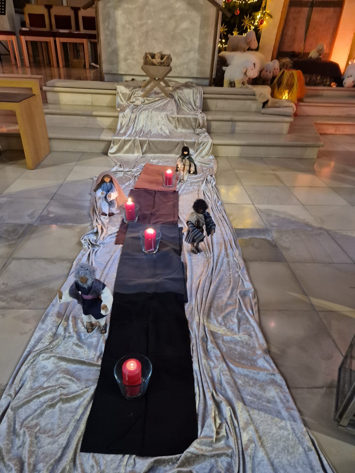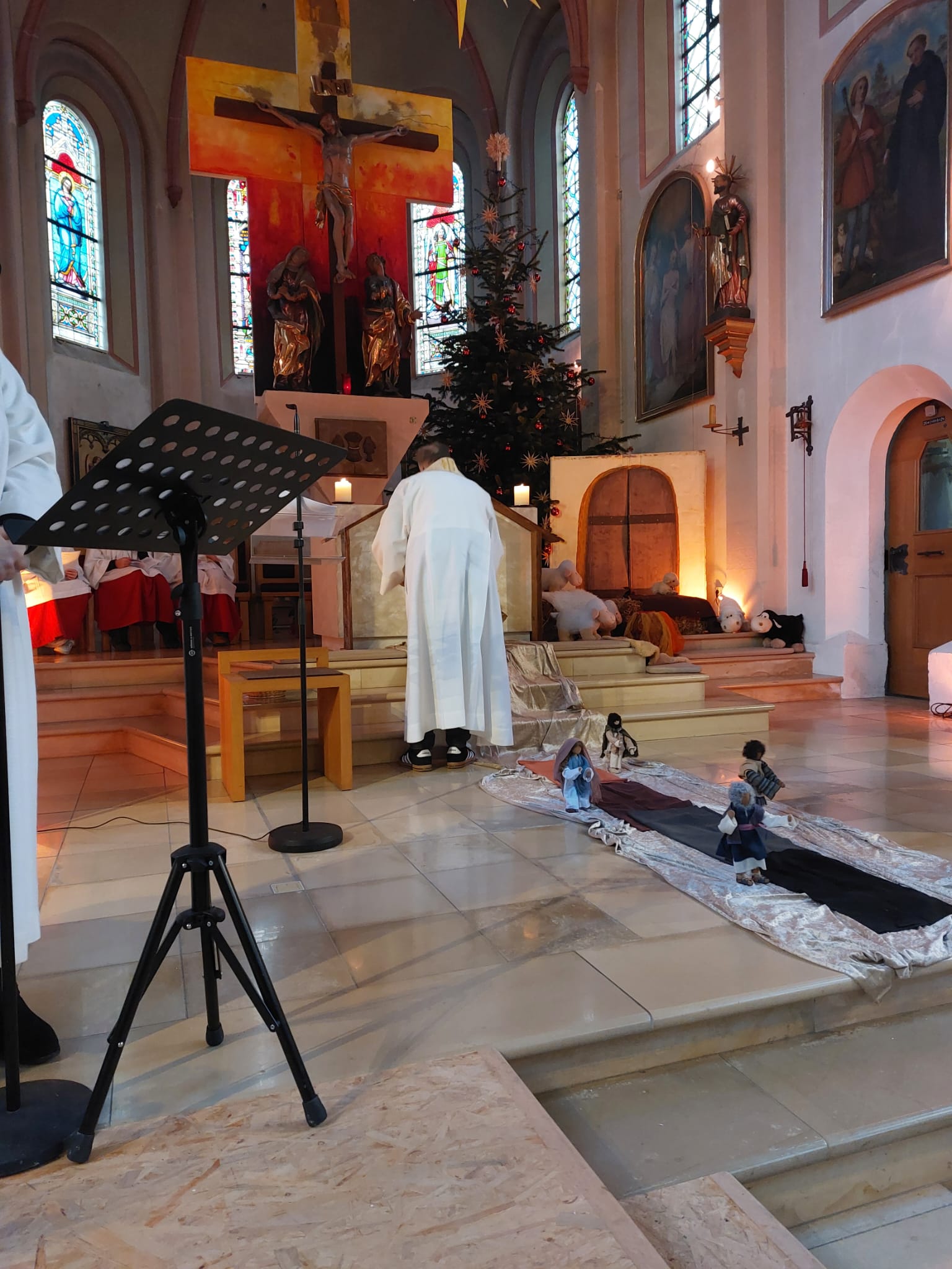 Zuvor hatten schon die Familien mit Klein- und Kindergartenkindern die Geburt Jesu in einem kindgerechten Gottesdienst gefeiert. Das Maskottchen der adventlichen Kindergottesdienste, Stern „Zacki“ alias Kinderwortgottesdienstleiterin Dr. Susanne Konrad, sowie Pfarrer Stefan Altschäffel und Gemeindereferentin Barbara Iberer ließen die Weihnachtsbotschaft in einer pantomimischen Mitmachgeschichte lebendig werden. Zu den Fürbitten entzündeten Kinder Lichter am Friedenslicht von Betlehem und stellten sie bei den adventlichen Gestalten Jesja, Johannes, Maria und Josef auf dem Weg zur Krippe ab. Die wunderbare musikalische Gestaltung übernahmen Adrian Dombroth am Klavier, Anna Beyerl an der Geige, Luisa Beyerl an der Gitarre, sowie Monika Schwarz am Cello. Ein großes Dankeschön für allen Einsatz.